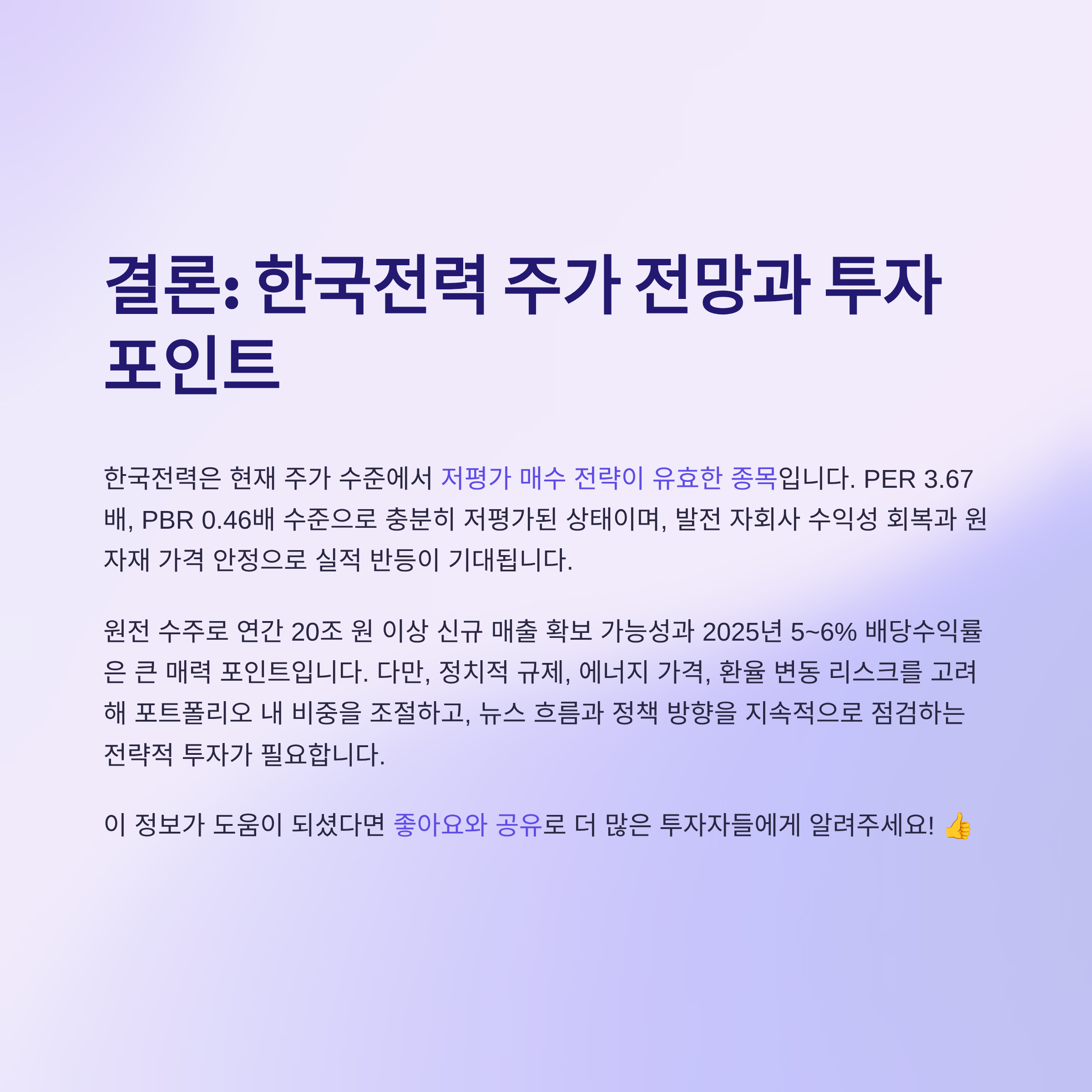 종합적으로 볼 때, 한국전력은 현재 주가 수준에서 저평가 매수 전략이 유효한 종목입니다. 다만, 리스크 요소를 고려해 포트폴리오 내 비중을 조절하고, 뉴스 흐름과 정책 방향을 지속적으로 점검하는 전략적 투자가 필요합니다.
