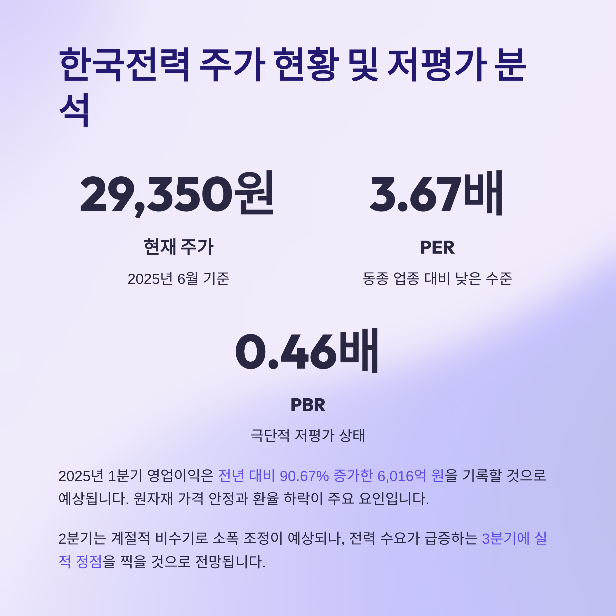 2025년 6월 기준, 한국전력의 주가는 약 29,350원 수준에서 거래되고 있으며, 이는 여러 밸류에이션 지표에서 볼 때 극단적인 저평가 상태로 판단됩니다. 특히 주가수익비율(PER)은 3.67배, 주가순자산비율(PBR)은 0.46배로, 동종 업종 대비 낮은 수치입니다.