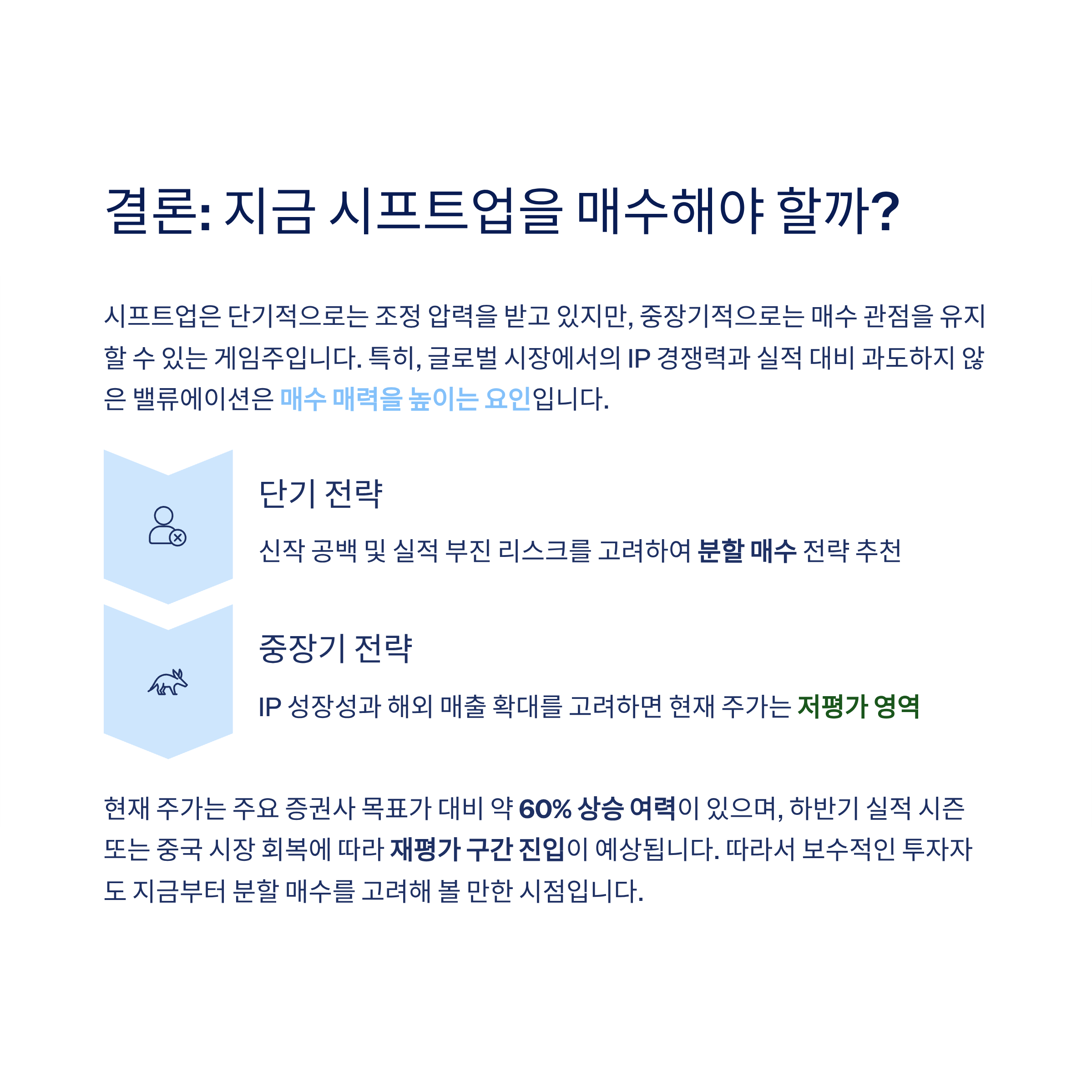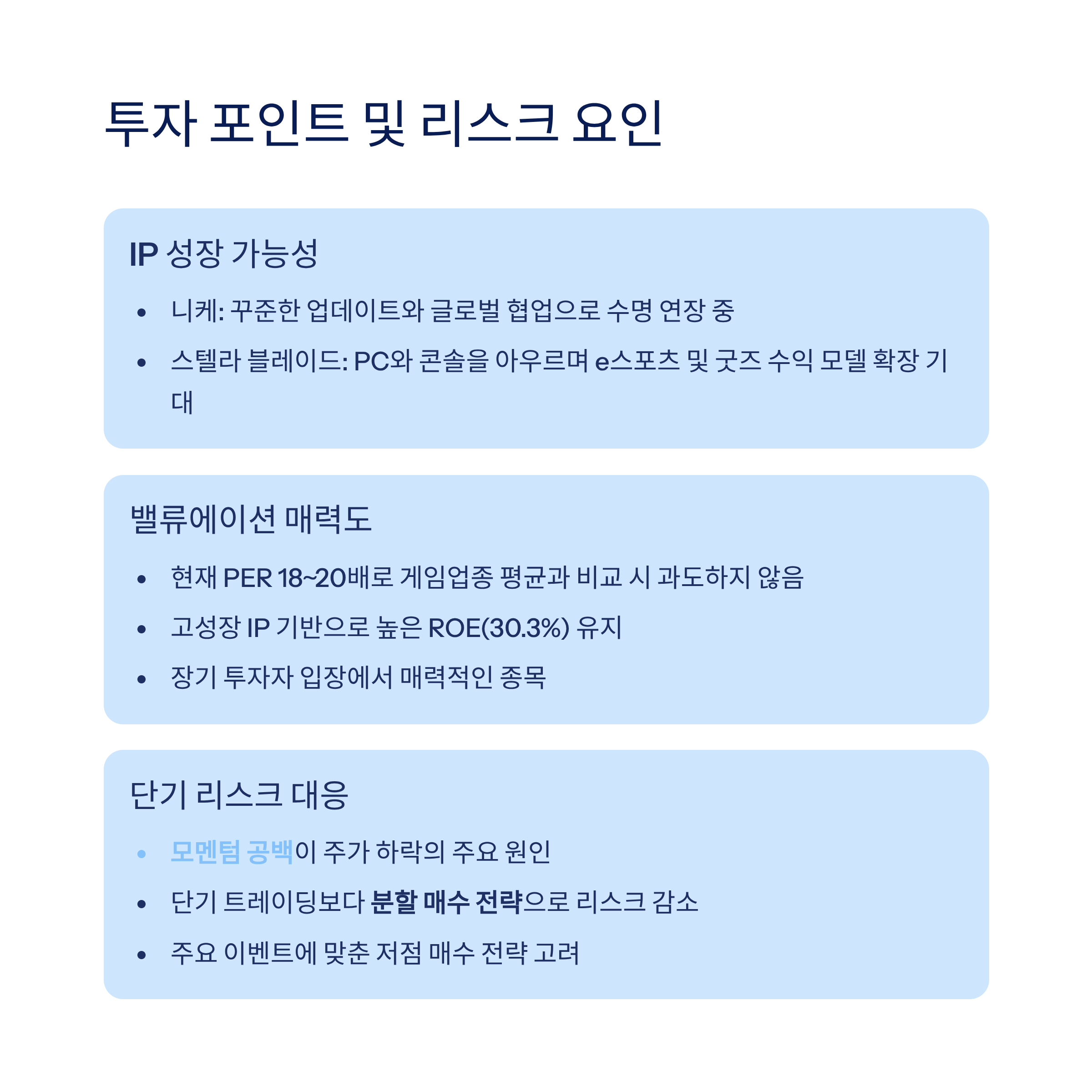 특히, 글로벌 시장에서의 IP 경쟁력과 실적 대비 과도하지 않은 밸류에이션은 매수 매력을 높이는 요인입니다.