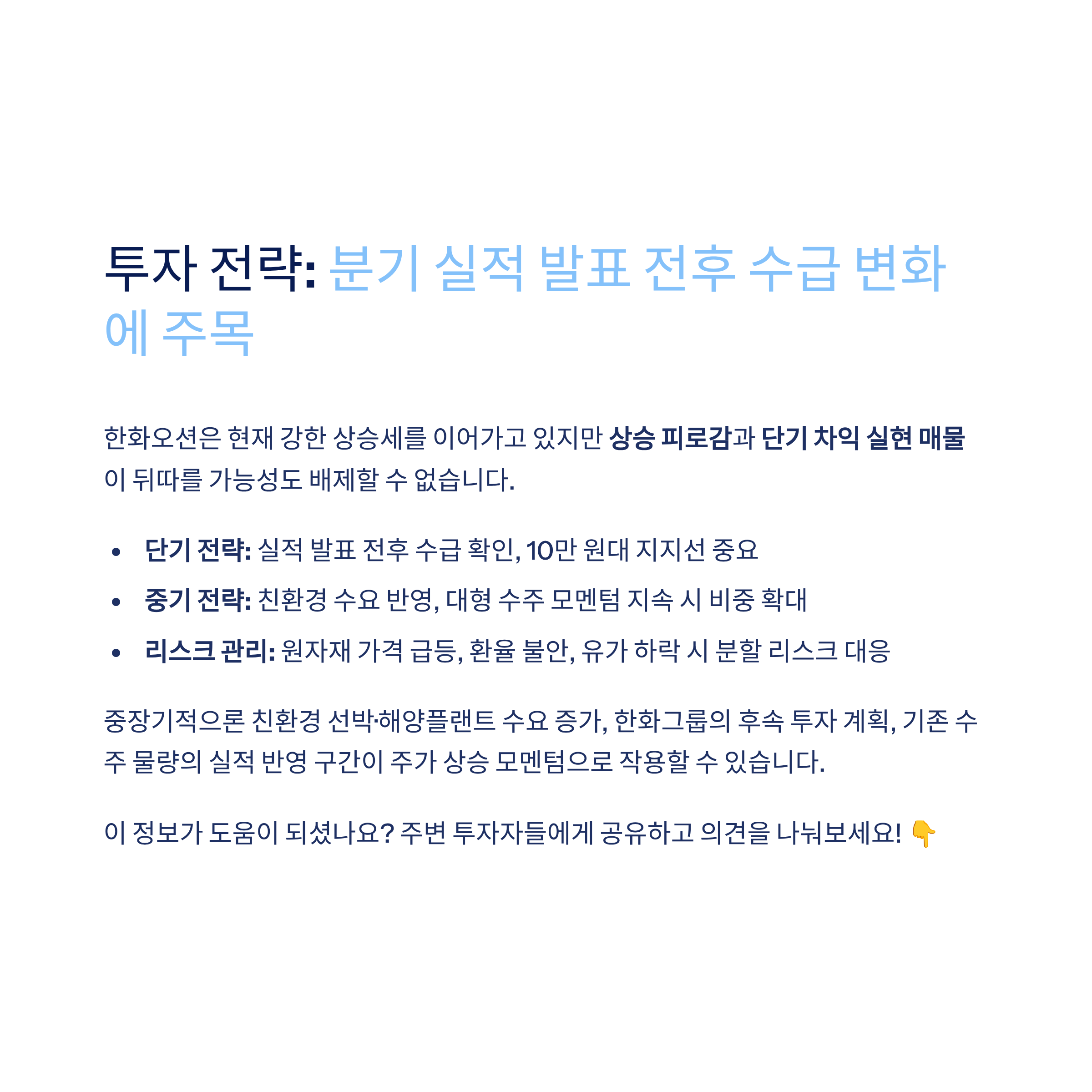 | 단기 전략 | 실적 발표 전후 수급 확인, 10만 원대 지지선 중요 |