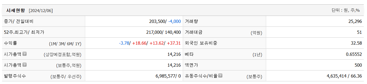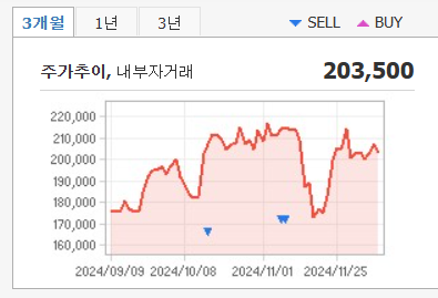 52주 최고가는 224,000원, 최저가는 139,100원으로, 최근 조정이 진행 중이나 기술적 저항선에 도달한 모습입니다.