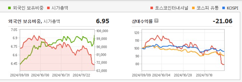 단기 포트폴리오를 구성할 때는 시가 총액과 장중 거래량도 체크해야 합니다. 포스코인터내셔널의 시가 총액은 6조9577억 원이며 장중 거래량은 1,057,881원 을 기록했습니다. 대주주의 정보는 크게 중요하지 않지만 장기적으로는 확인하는 것이 좋겠습니다.