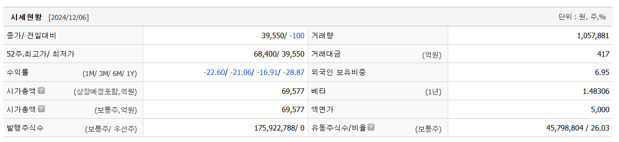 포스코인터내셔널의 현재 주가는 39,550원입니다. 전일 대비 -100원 이동한 모습입니다. 시가 총액은 6조9577억 원이며 발행 주식은 총 175,922,788주 입니다. 외국인이 보유한 비중은 6.95%입니다. 포스코인터내셔널 기업의 영업이익은 억 원을 달성했으며 배당 수익율은 1.60% 입니다.