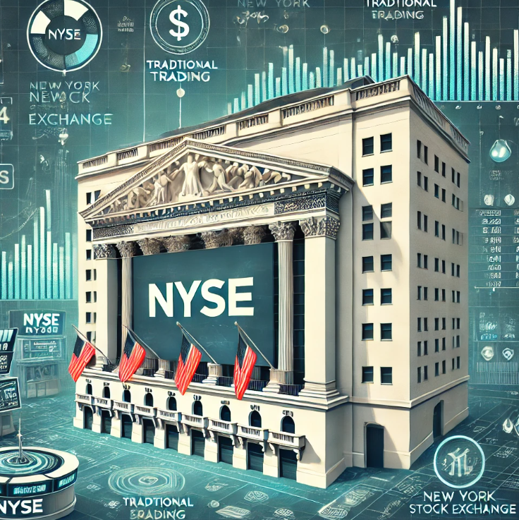 뉴욕증권거래소는 1792년에 설립된 전통적인 거래소로, 월가의 상징적 역할을 수행합니다. 물리적 거래소가 중심이 되는 오프라인 기반 거래가 특징이며, 이는 인간 브로커의 중개를 통해 이루어집니다.