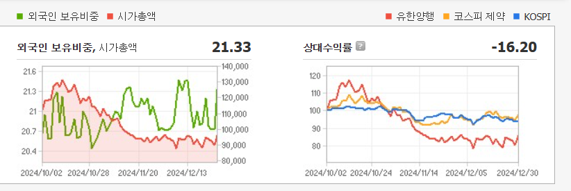 단기 포트폴리오를 구성한다면, 시가 총액과 장중 거래량도 살펴봐야 합니다. 유한양행의 시가 총액은 9조5850억 원이며 장중 거래량은 2,312,288원 을 기록했습니다. 대주주의 정보는 크게 중요하지 않을 수도 있지만 장기적인 관점에서는 대주주 정보도 확인해보는 것이 좋겠습니다.
