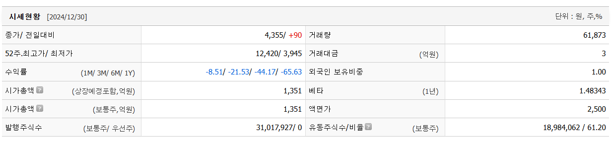 단기 포트폴리오를 구성할 때는 시가 총액과 장중 거래량도 확인해야 합니다. STX의 시가 총액은 1351억 원이며 장중 거래량은 61,873원 을 기록했습니다. 대주주의 정보는 크게 중요하지 않지만 장기적인 관점에서는 확인하는 것이 좋겠습니다.