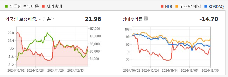단기 포트폴리오를 구성한다면, 시가 총액과 장중 거래량도 살펴봐야 합니다. HLB의 시가 총액은 9조6044억 원이며 장중 거래량은 891,957원 을 기록했습니다. 대주주의 정보는 중요하지 않을 수도 있지만 장기적인 관점에서는 확인이 필요합니다.