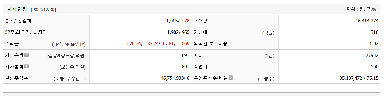 단기 포트폴리오를 구성할 때는 시가 총액과 장중 거래량도 확인해야 합니다. 동원금속의 시가 총액은 891억 원이며 장중 거래량은 16,414,374원 을 기록했습니다. 대주주의 정보는 중요하지 않을 수 있으나 장기적인 관점에서는 확인해보는 것이 좋겠습니다.