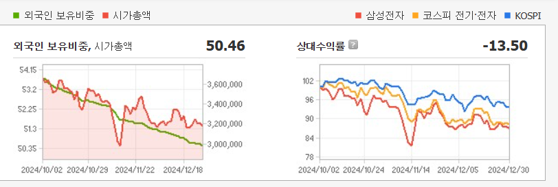 단기 포트폴리오를 구성할 경우 시가 총액과 장중 거래량도 확인해야 합니다. 삼성전자의 시가 총액은 318조7864억 원이며 장중 거래량은 12,624,702원 을 기록했습니다. 대주주의 정보는 크게 중요하지 않을 수 있으나 장기적인 관점에서는 확인해보는 것이 좋겠습니다.