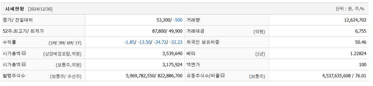 삼성전자의 현재 주가는 53,200원입니다. 전일 대비 -500원 이동한 모습입니다. 시가 총액은 318조7864억 원이며 발행 주식은 총 5,969,782,550주 입니다. 외국인이 보유한 비중은 50.46%입니다. 삼성전자 기업의 영업이익은 억 원을 달성했으며 배당 수익율은 1.84% 입니다.
