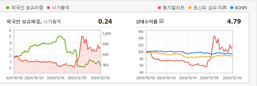 단기 포트폴리오를 구성할 시에는 시가 총액과 장중 거래량도 살펴봐야 합니다. 형지엘리트의 시가 총액은 883억 원이며 장중 거래량은 4,305,889원 을 기록했습니다. 대주주의 정보는 중요하지 않을 수 있지만 장기적인 관점에서는 확인하는 것이 좋겠습니다.