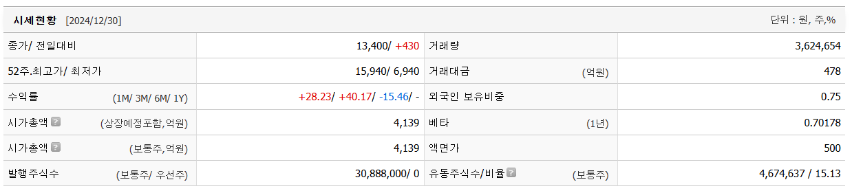 하이젠알앤엠의 현재 주가는 13,400원입니다. 전일 대비 -15.46원 이동한 모습입니다. 시가 총액은 5381억 원이며 발행 주식은 총 30,888,000주 입니다. 외국인이 보유한 비중은 0.75%입니다. 하이젠알앤엠 기업의 영업이익은 억 원을 달성했으며 배당 수익율은 % 입니다.