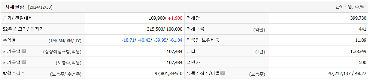 에코프로비엠의 현재 주가는 109,900원입니다. 전일 대비 -18.71원 이동한 모습입니다. 시가 총액은 10조3180억 원이며 발행 주식은 총 97,801,344주 입니다. 외국인이 보유한 비중은 11.89%입니다. 에코프로비엠 기업의 영업이익은 억 원을 달성했으며 배당 수익율은 % 입니다.